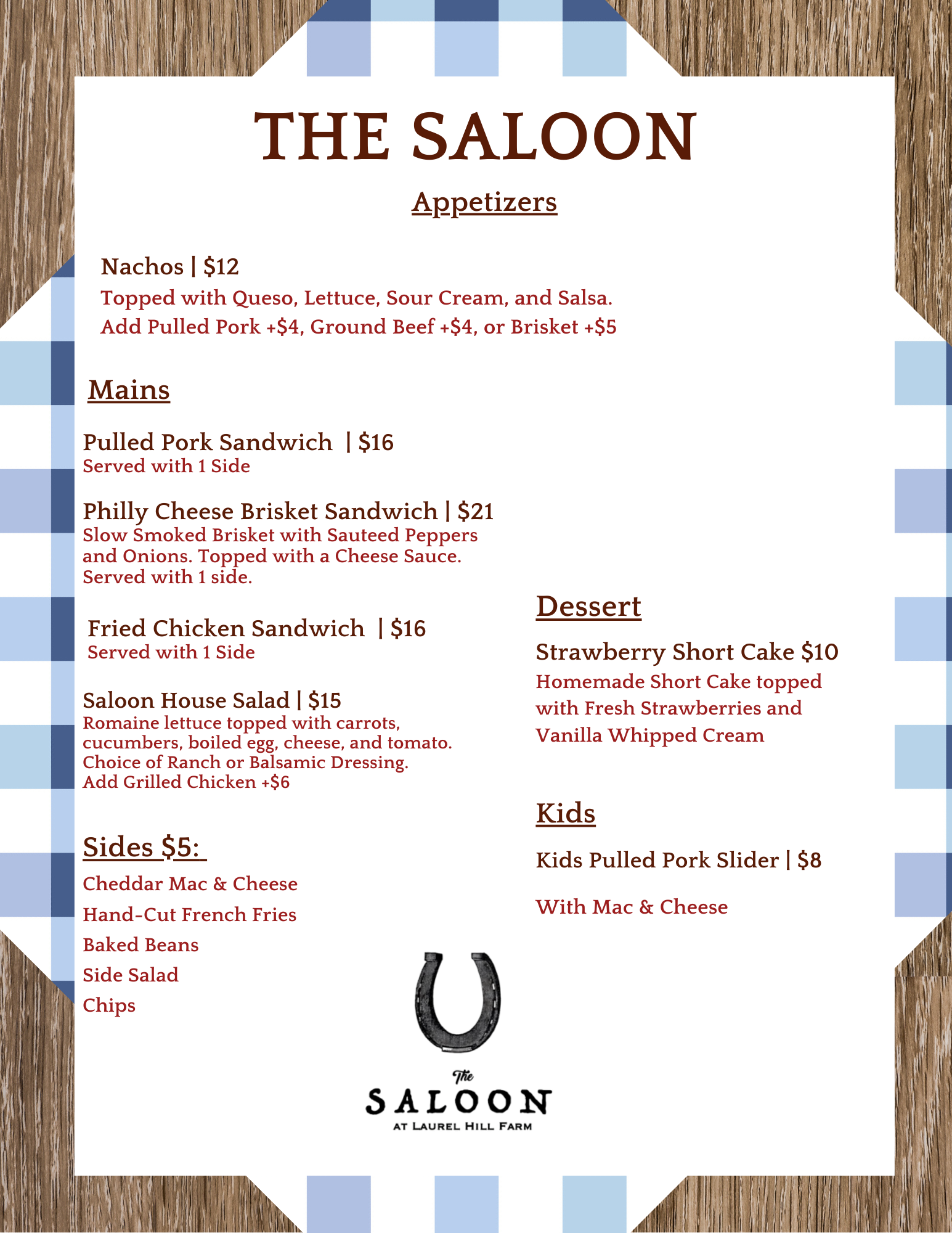 Step into the spirit of the Old West at The Saloon — a rustic, western-themed gathering place nestled on a real working horse and hay farm. Family-owned and operated, The Saloon brings genuine Southern hospitality to every plate and pour.
